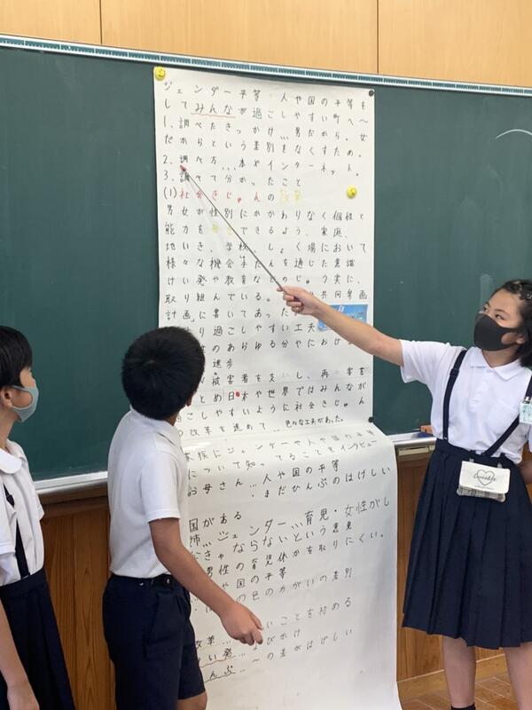 国語の「みんなが過ごしやすい町へ」の授業では、班ごとに作った報告書をみんなに発表しました。