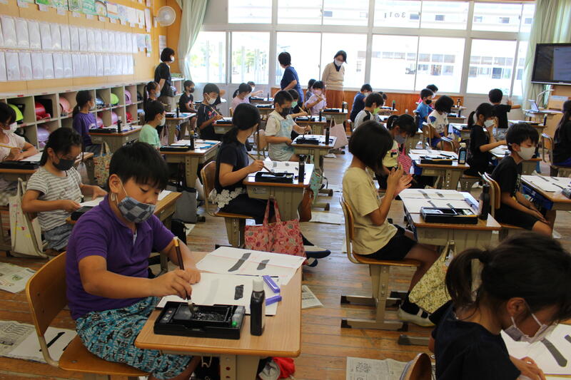 手が真っ黒になったり、いつの間にかおでこに墨がついたり…。ハプニング続出の書写の授業になりそうですが、これからも楽しく学習していきたいと思います。