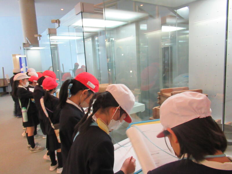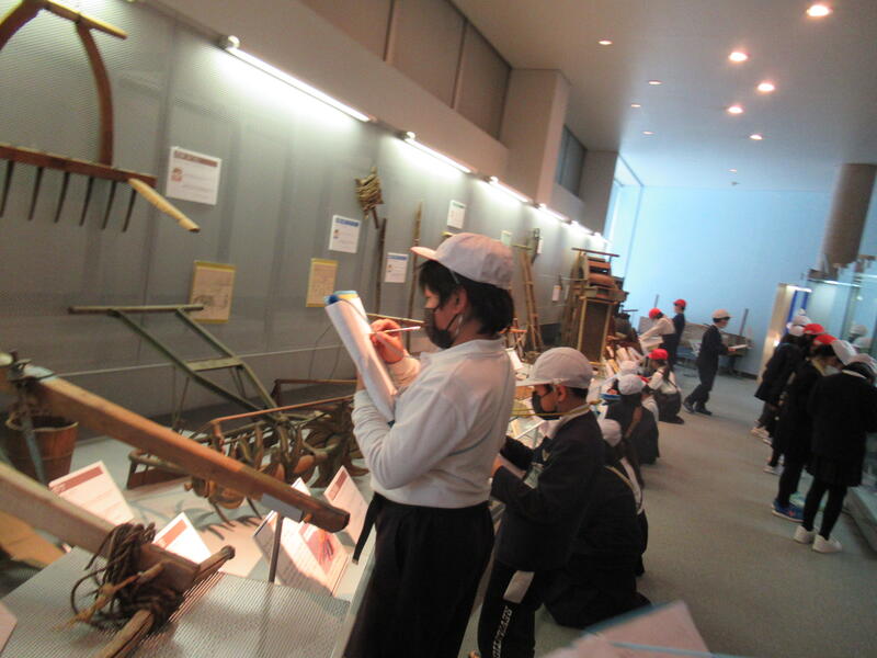 昔の道具がたくさん置いてあり、子供たちは興味津々!「へぇ~」「知らなかった!」とつぶやきながら学芸員さんの話を聞いていました。そして、しおりにたくさんメモをして帰ってきました。
