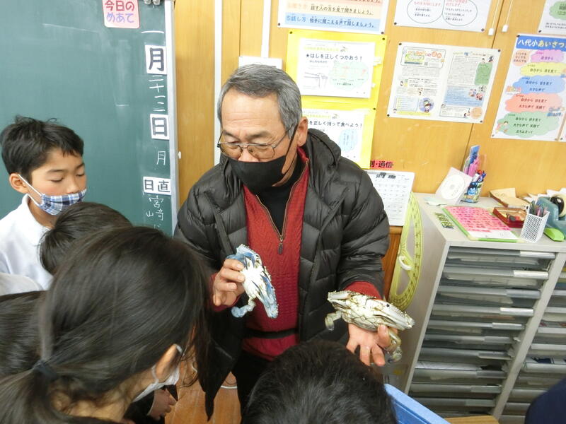 実際に八代でとれたカニをもってきていただき、触れて大興奮の子供たちでした。