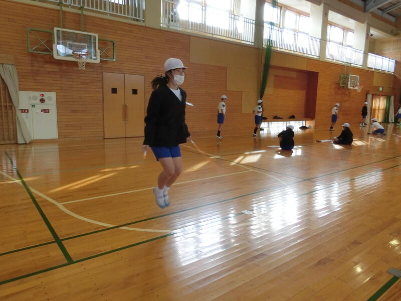 今週から「ランランタイム」(業間のランニング)に代わり、「ぴょんぴょんタイム」として、走るのではなく、軽快な音楽に合わせて単縄跳びに取り組んでいます。