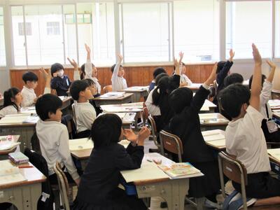 どの学級をのぞいても、デジタル教科書(今年度より導入)の活用や具体物操作、リズムにのせた言葉の暗唱、効果的な話し合い活動、分かり易い板書、ALTの活用、学習支援ソフト(スタディサプリやeライブラリー)の活用、認め・ほめ・励まし・伸ばす声掛けなど、子供たちの興味・感心・意欲を掻き立てるような指導の工夫が見られます(^_^)v