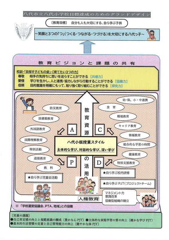 八代小教育目標:「自分も人も大切にする、自ら学ぶ子供」