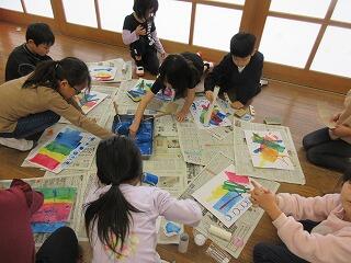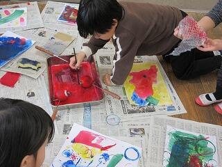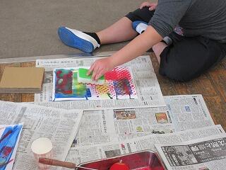 図工の時間に、いろいろな材料を持ち寄り、いろいろな色をローラーで広げたり、スタンプのように押して、素敵な世界を作りました。
