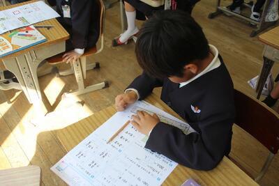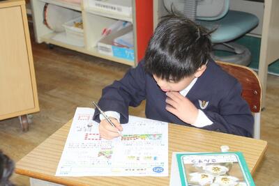 算数のプリントは、自分でまるつけをしました。 しっかり聞きながら、自分の番を間違えず、その表 情は真剣そのものです。