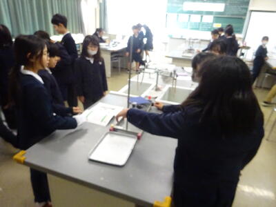 理科専科の先生が授業を進めてくださり、安全に実験ができるように担任の私も補助で入りました。