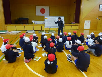 火災体験の注意事項を聞く様子 講師の先生を見て、聞く事ができていました。 |