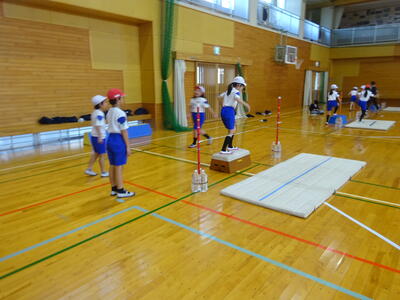 最近の体育では、「走り高跳び」を行っています。この単元では、本校の校長の野添が担当しています。