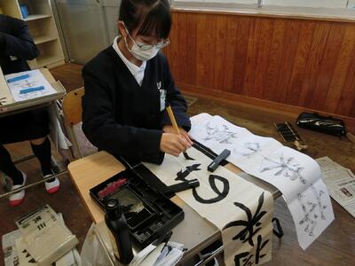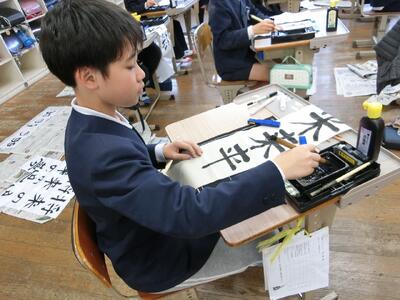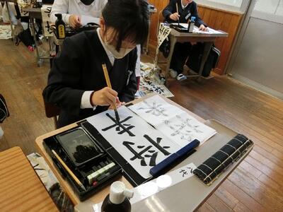 | 書写展に向けて、最後の清書に取組ました。文字のバランスを考え、手本を見ながら真剣に書くことができました。作品につきましては、授業参観の際にご覧下さい。 |