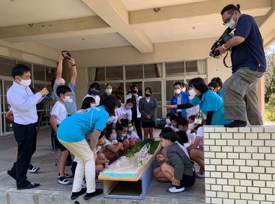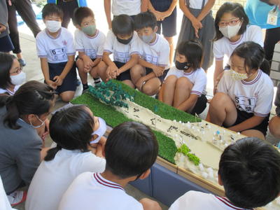 5年生が球磨川の模型を使って、川の氾濫を防ぐ堤防の働きを学びました。昨年度から、球磨川や水無川などを題材にした防災教育に全学年で取り組んでいます。国土交通省八代河川国道事務所の職員の方のお話のあと、山間部から平野に流れ込む川を再現した手作りの模型に実際に水を流しました。