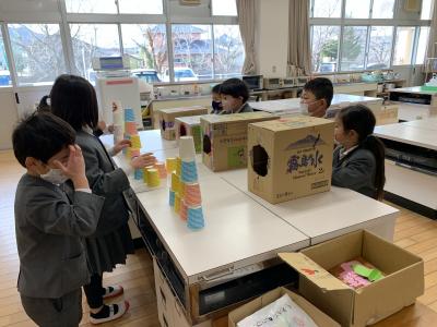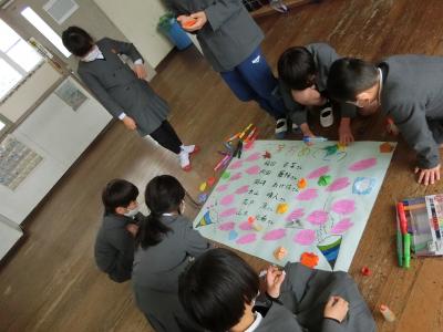 3/8(月)「わくわくタイム」で、縦割り班ごとに、卒業生へのお祝いメッセージを作りました。1年間リーダーとして頑張った卒業生に感謝の気持ちと卒業のお祝いを伝えます。