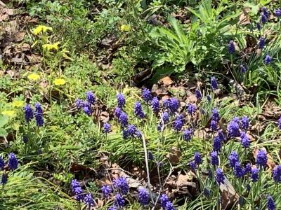 校内にある新川のほとりは、白、黄、紫・・・といろとりどりの花が咲き乱れています。紫色の花は「ムスカリ」だそうです。鳥も遊びに来ます。桜ももうすぐ開花するでしょうか。