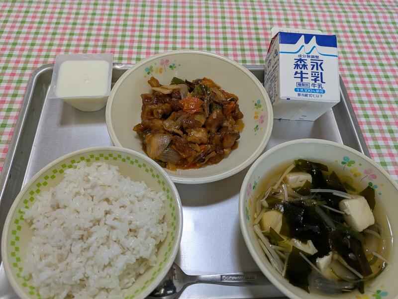 今日のメニューは、麦ご飯、酢鶏、わかめスープ、杏仁豆腐、牛乳でした。