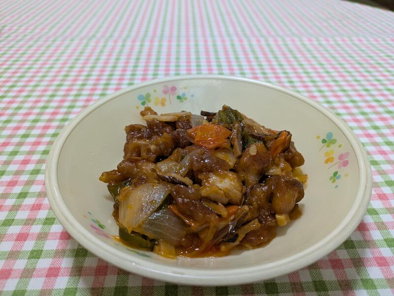 酢鶏は、ほどよく甘酢が効いた甘辛味にしてあり、鶏むね肉と筍、人参、玉ねぎ、ねぎ、ピーマン、椎茸の具もたくさん入っていて、栄養満点のおいしい酢鶏でした。