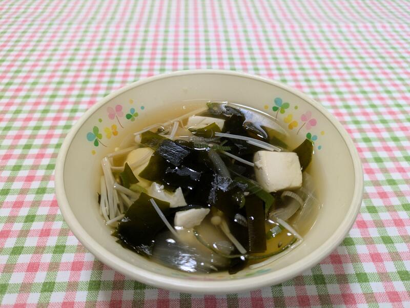 ワカメスープは、鰹と昆布の出汁に薄口醤油の抜群のおいしさのスープが、ワカメと玉ねぎ、エノキ、豆腐の具にしみ込んで逸品のワカメスープでした。