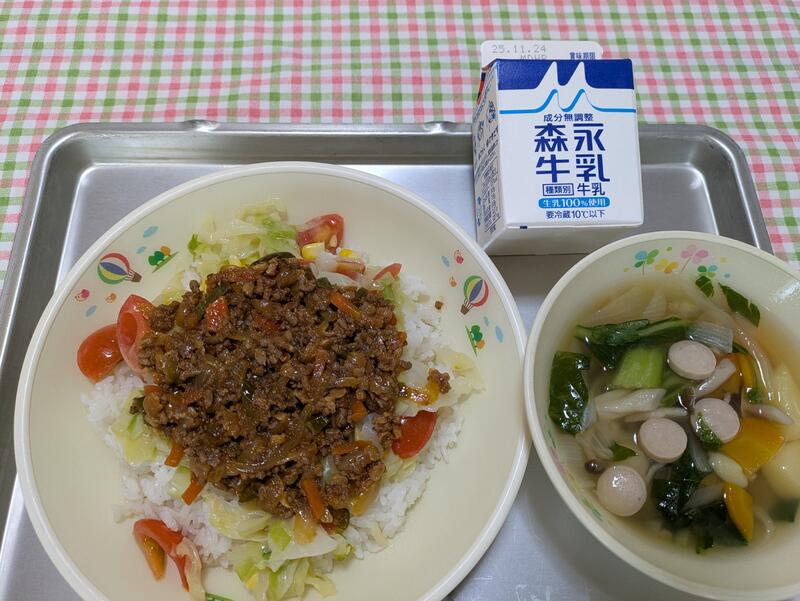 今日のメニューは、タコライス、野菜スープ、トマトサラダ、牛乳でした。