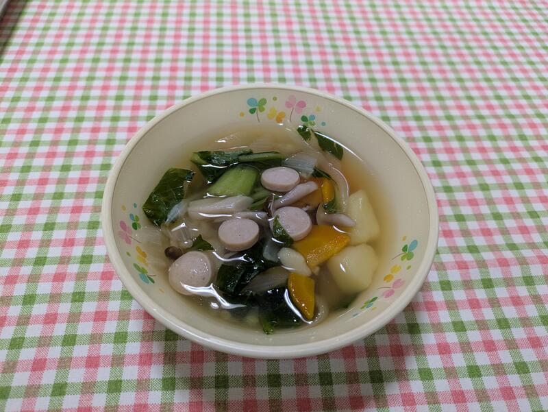 野菜スープは、チキンブイヨンにほどよく塩が効いていて、具材の旨味と混ざり合って、これまたおいしかったです。温かくて、ウインナーも入っていて、子どもたちも喜んで食べていました。