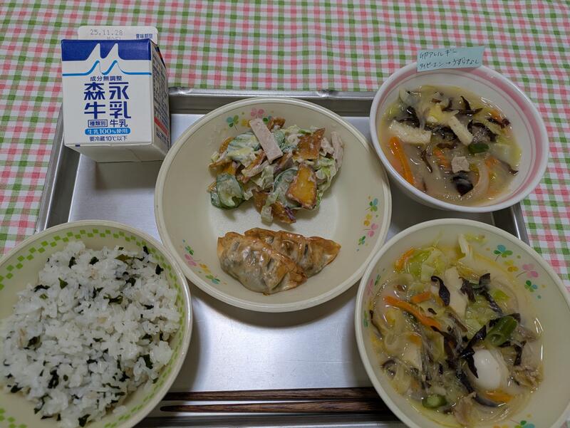 今日のメニューは、わかめご飯、タイピーエン(卵アレルギー対応は、うずらの卵なし。)、ひじき餃子、さつまいもサラダ、牛乳でした。