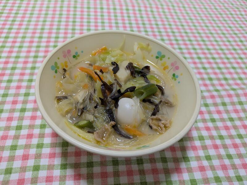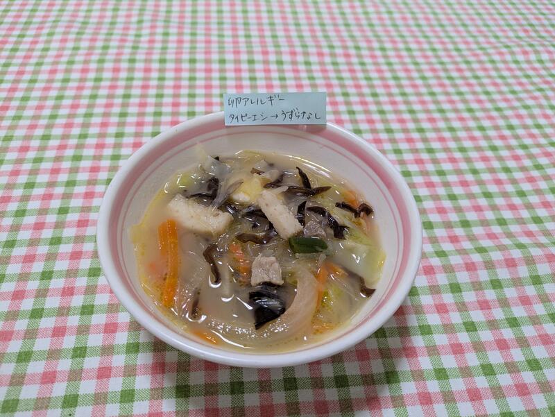 横島小のタイピーエンは、豚もも肉にイカ、きくらげ、人参、玉ねぎ、キャベツ、インゲンのたくさんの具材を炒めて、うずらの卵と一緒に子どもが喜ぶ白湯スープで煮込んでありました。思わず、“うまい!!”と言ってしまうほどのおいしさでした。