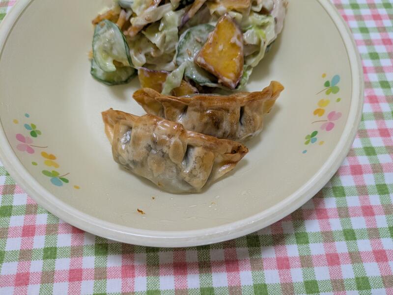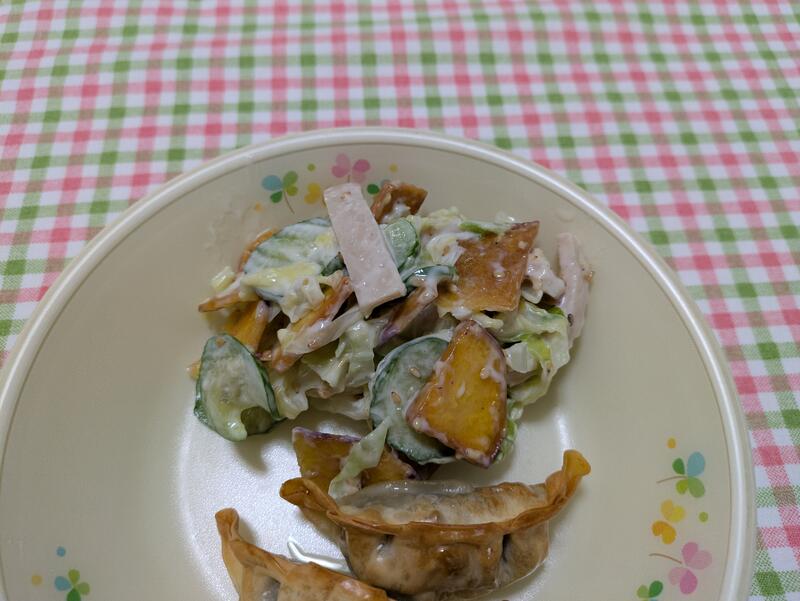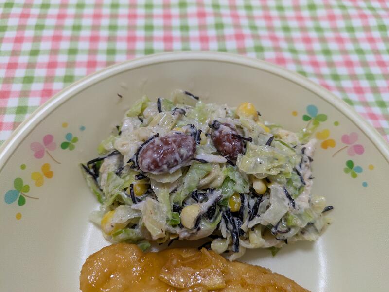 さつまいもサラダは、たくさんのキャベツと胡瓜に鶏ハムと素揚げにしたサツマイモをまぜて、子どもたちが好きなノンエッグマヨネーズで味付けしてありました。マヨネーズがからんだ具材に、素揚げされたサツマイモの食感がとてもよくて、逸品のおいしさでした。
