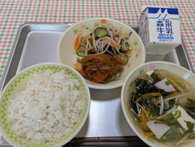 今日のメニューは、麦ご飯、中華スープ、魚のチリソースかけ、もやしの中華和え、牛乳でした。