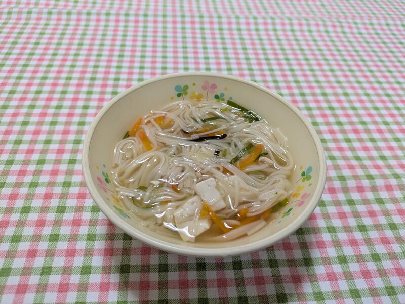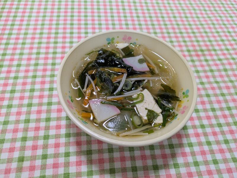 人参、玉ねぎ、ねぎ、エノキに、わかめやかまぼこ、そして、春雨の具材を薄口醬油をベースにした中華スープにしてありました。胡麻油の香りとほどよい塩加減がとてもおいしいスープでした。