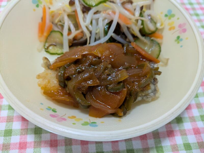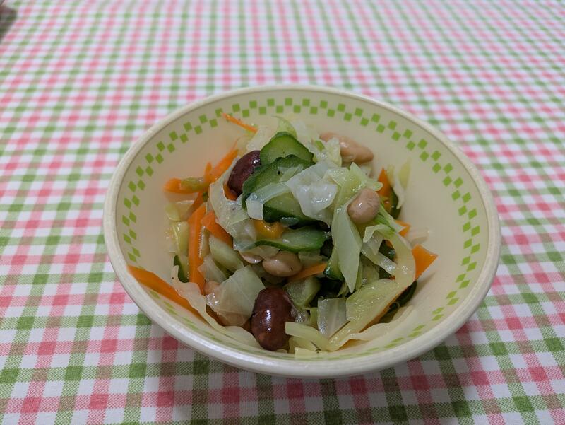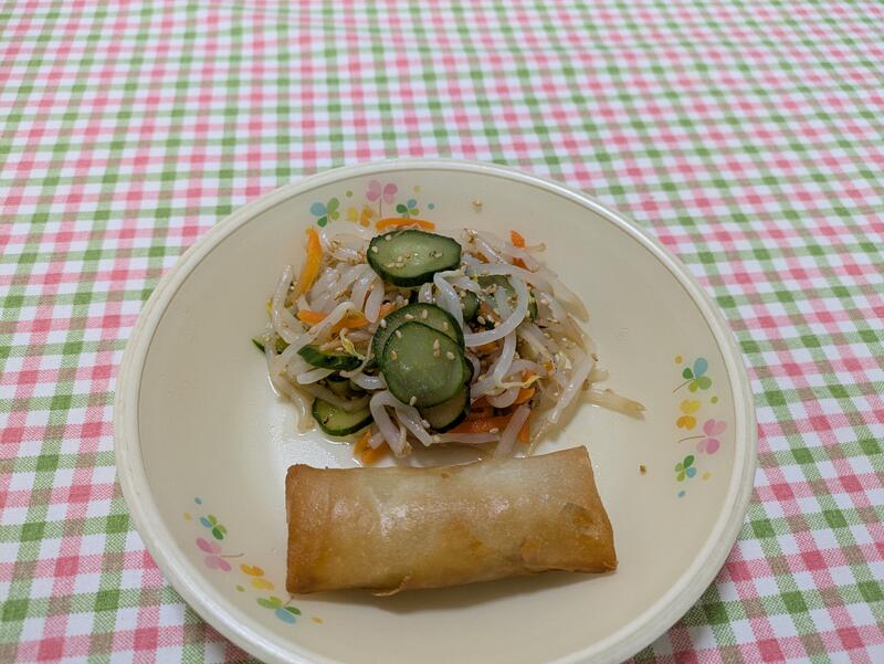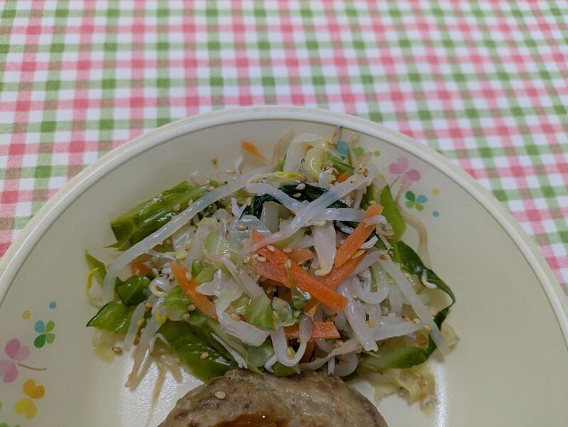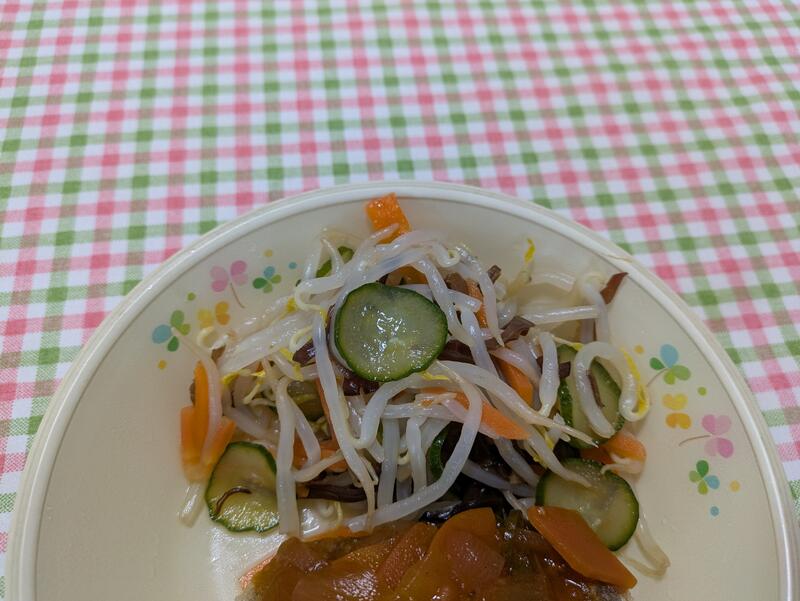 もやしの中華和えは、メインのもやしがたっぷりと入っていて、人参や胡瓜、きくらげもたくさん入れてありました。味付けは、甘酢がほどよく効いていて、胡麻油の香りもよくて、とてもおいしかったです。横島小の和え物やサラダは、身体の調子を整える野菜が、種類も量もたくさん入っていて、その上においしい味付けです。心から感謝します。