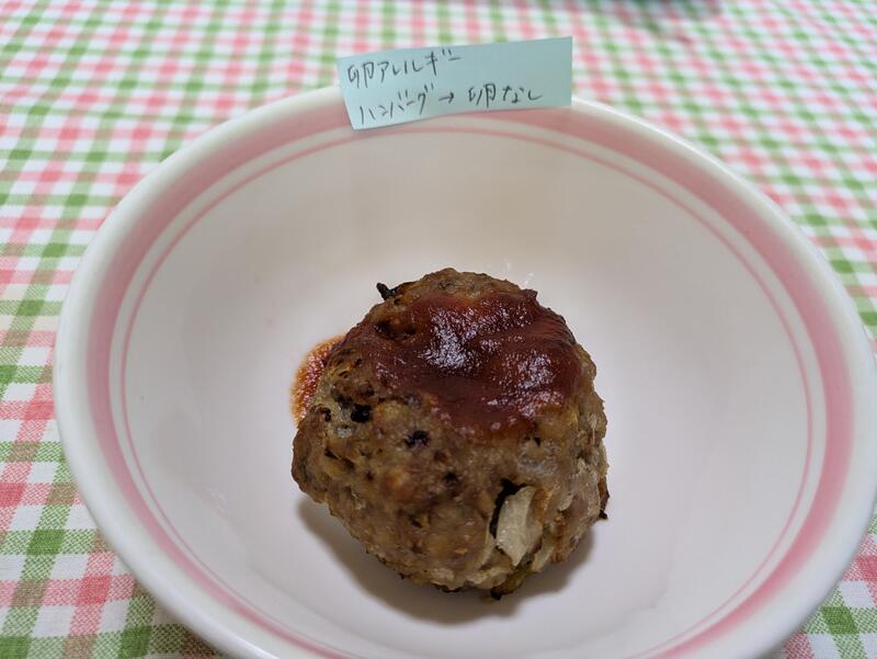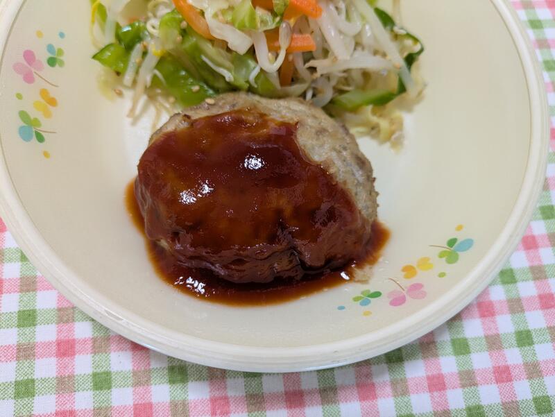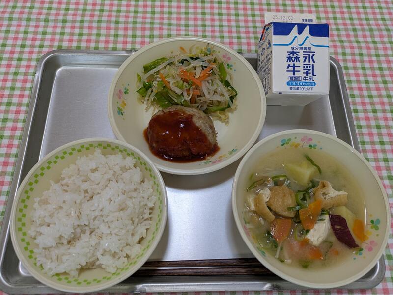今日のメニューは、麦ご飯、さつま芋の味噌汁、手作りハンバーグ(卵アレルギー対応は、卵なし。)、じゃこと野菜の和え物、牛乳でした。