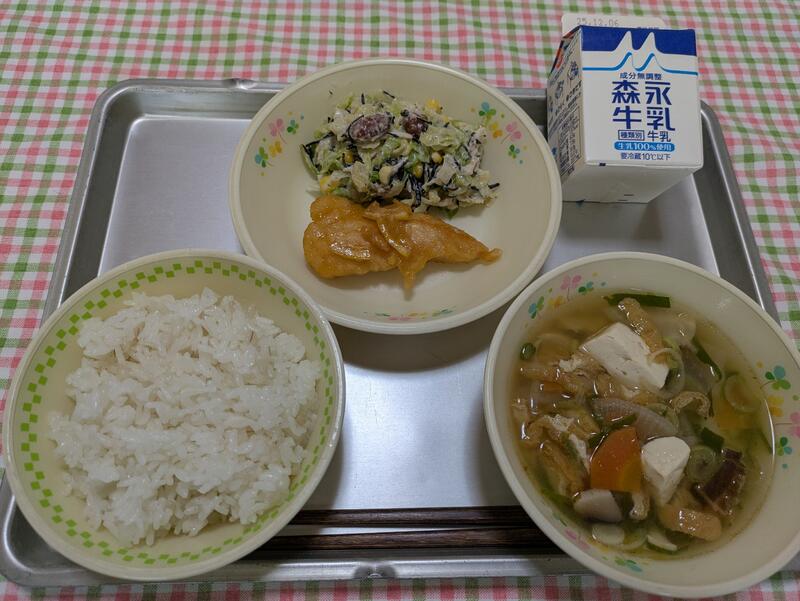 今日のメニューは、麦ご飯、けんちん汁、ささ身のレモン漬け、胡豆昆サラダ、牛乳でした。