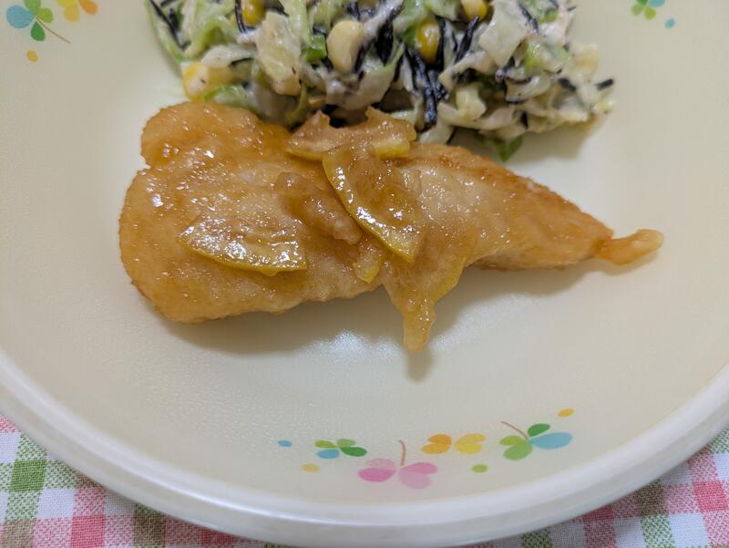 今日は、子どもたちに一番人気のささ身のレモン漬けでした。鶏のささ身をからっと揚げて、横島小特製の甘酸っぱいレモンたれに漬けた超逸品のおいしい、ささ身のレモン漬けでした。