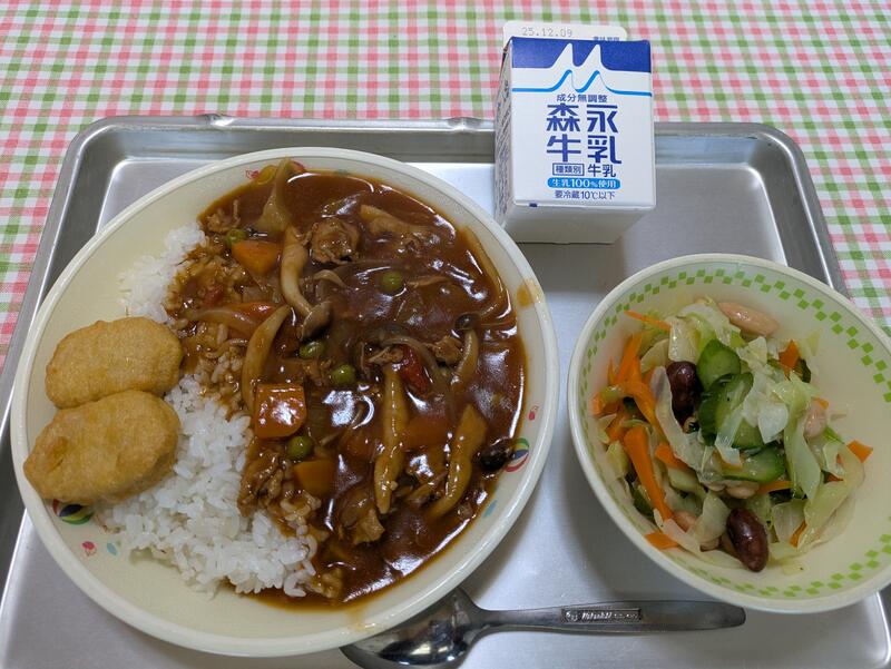 今日のメニューは、ハヤシライス、チキンナゲット、ビーンズサラダ、牛乳でした。
