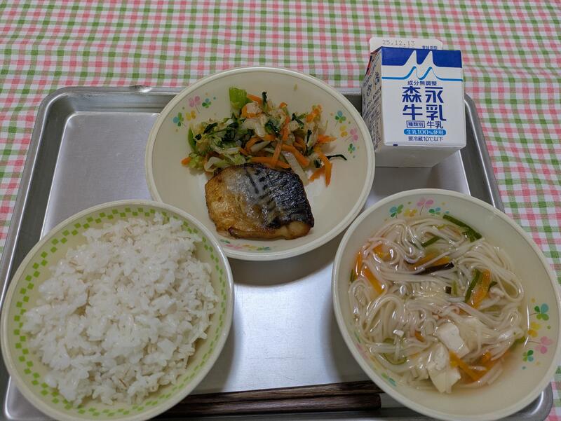 今日のメニューは、麦ご飯、ふしそう麺汁、鯖の竜田焼、白菜のおかか和え、牛乳でした。