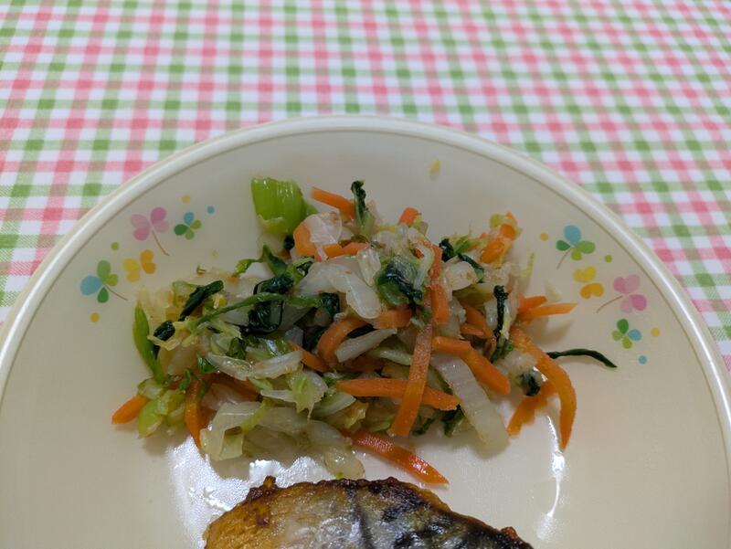 じゃこと野菜の和え物は、いつものようにたくさんの野菜においしい甘酢で味付けられて、じゃこもたっぷりと入れてあり、栄養たっぷりでとてもおいしい和のサラダでした。