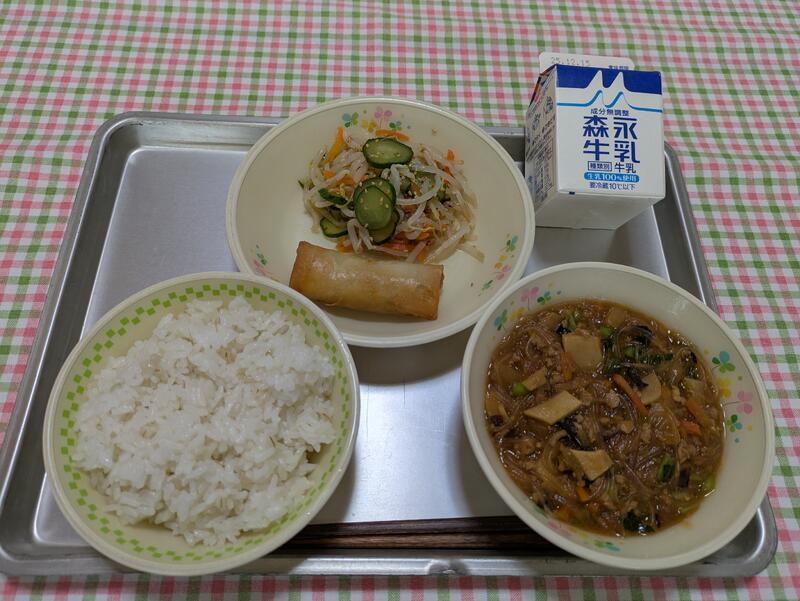 今日のメニューは、麦ご飯、マーボー春雨、春巻き、中華和え、牛乳でした。
