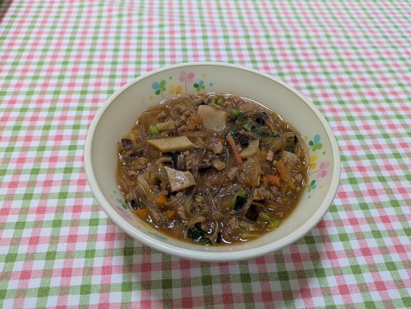 マーボー春雨は、豆板醤に横島小特製の調味料を加えて、子どもたちに合う味に仕上げてありました。具材にも春雨にも味がしみ込んで、とてもおいしいマーボー春雨でした。