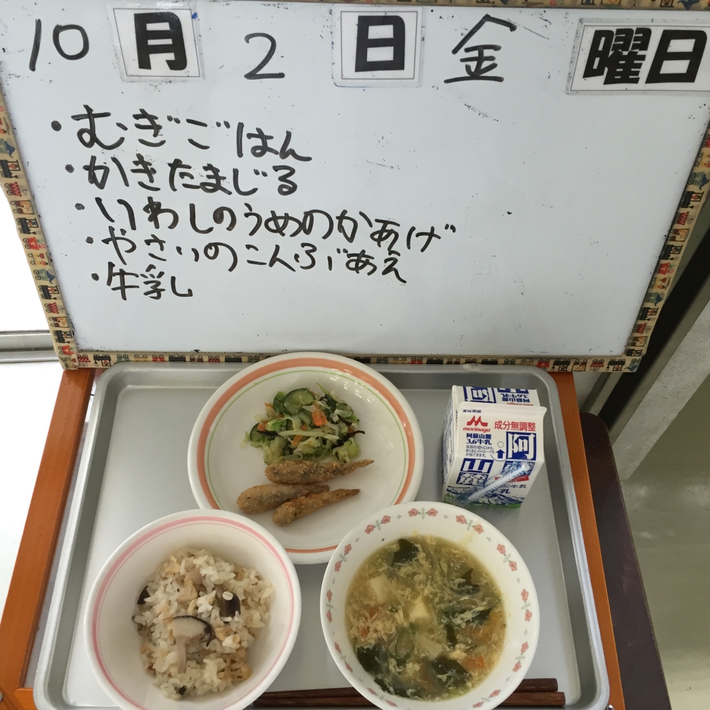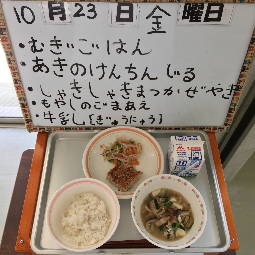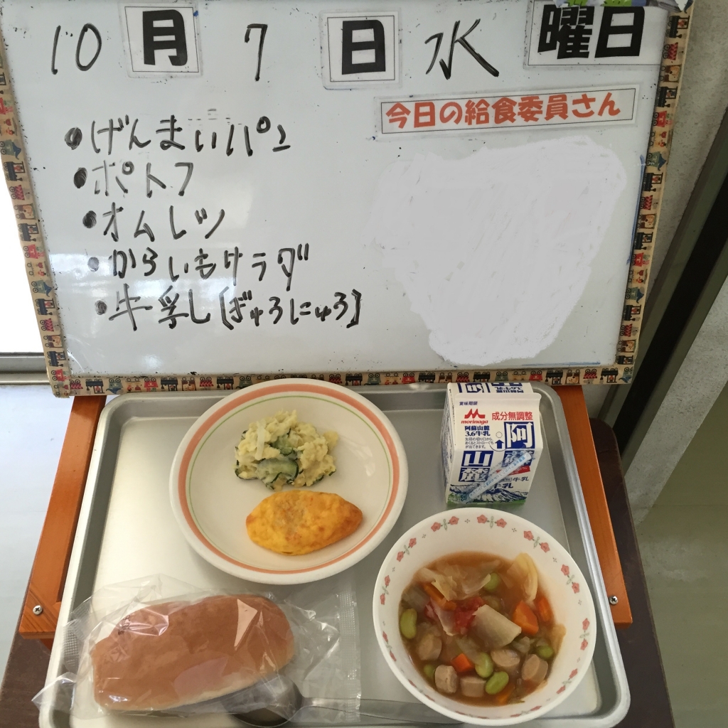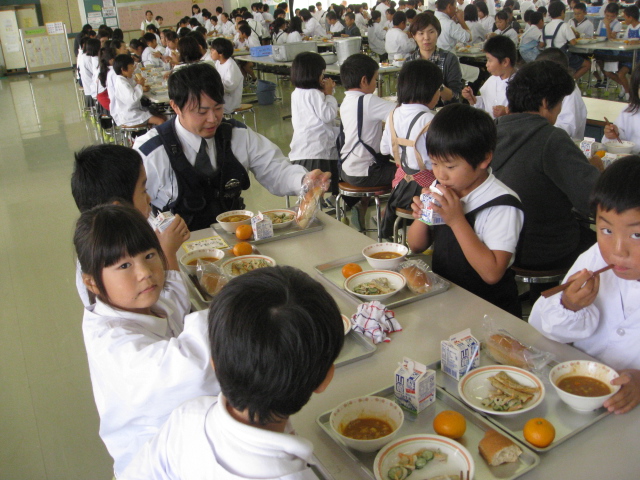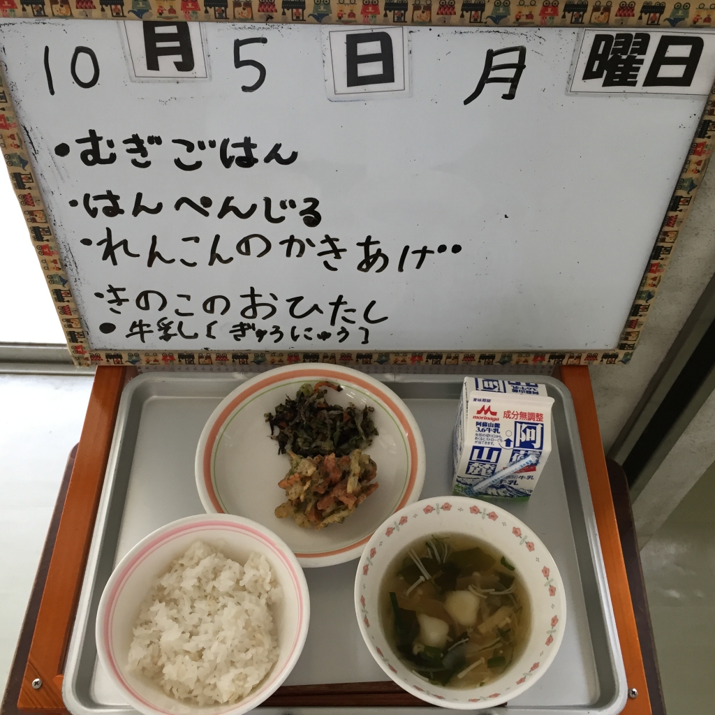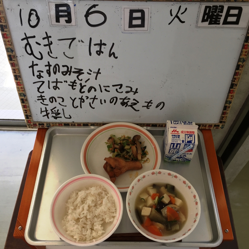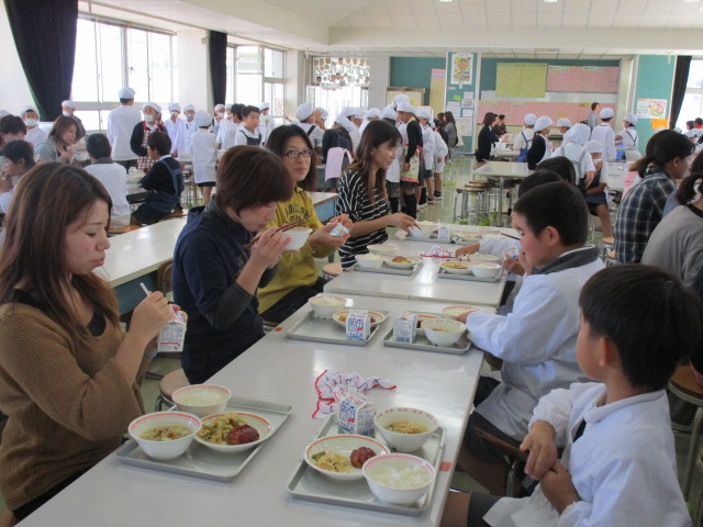 10月5日(月)横島小学校では、広いランチルームに全校児童が集まって給食を食べています。となりの給食室で、給食の先生方が一生懸命に給食を作っています。できたてのおいしい給食を毎日食べることができるこどもたちは幸せです。