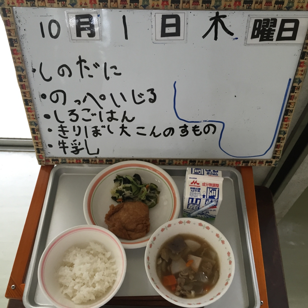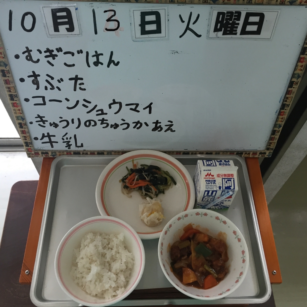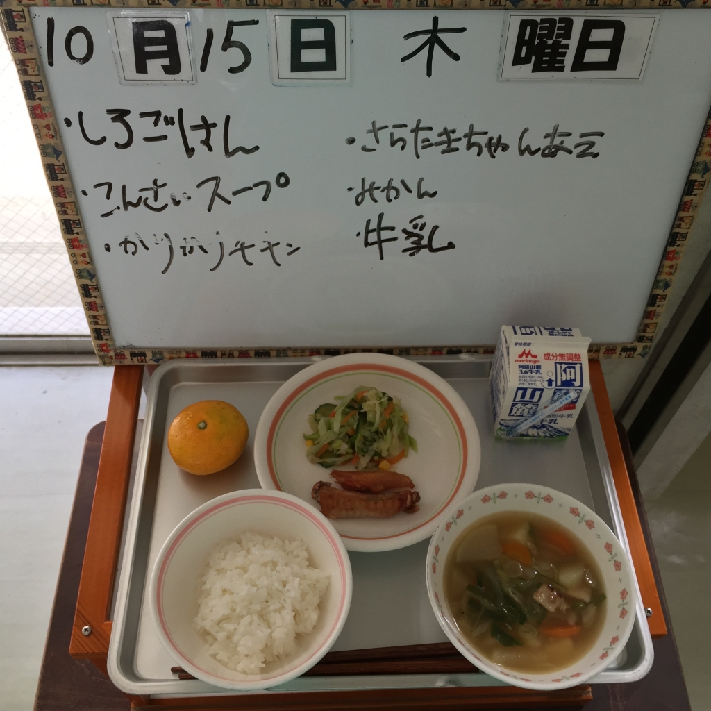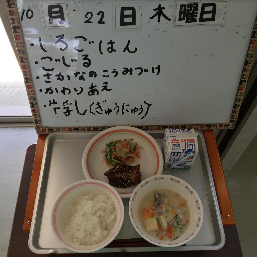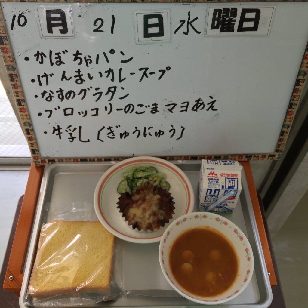 10月5日(月)横島小学校では、広いランチルームに全校児童が集まって給食を食べています。となりの給食室で、給食の先生方が一生懸命に給食を作っています。できたてのおいしい給食を毎日食べることができるこどもたちは幸せです。