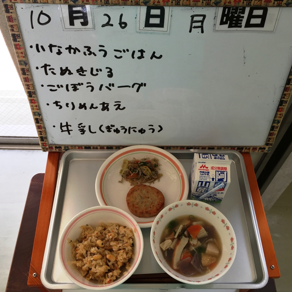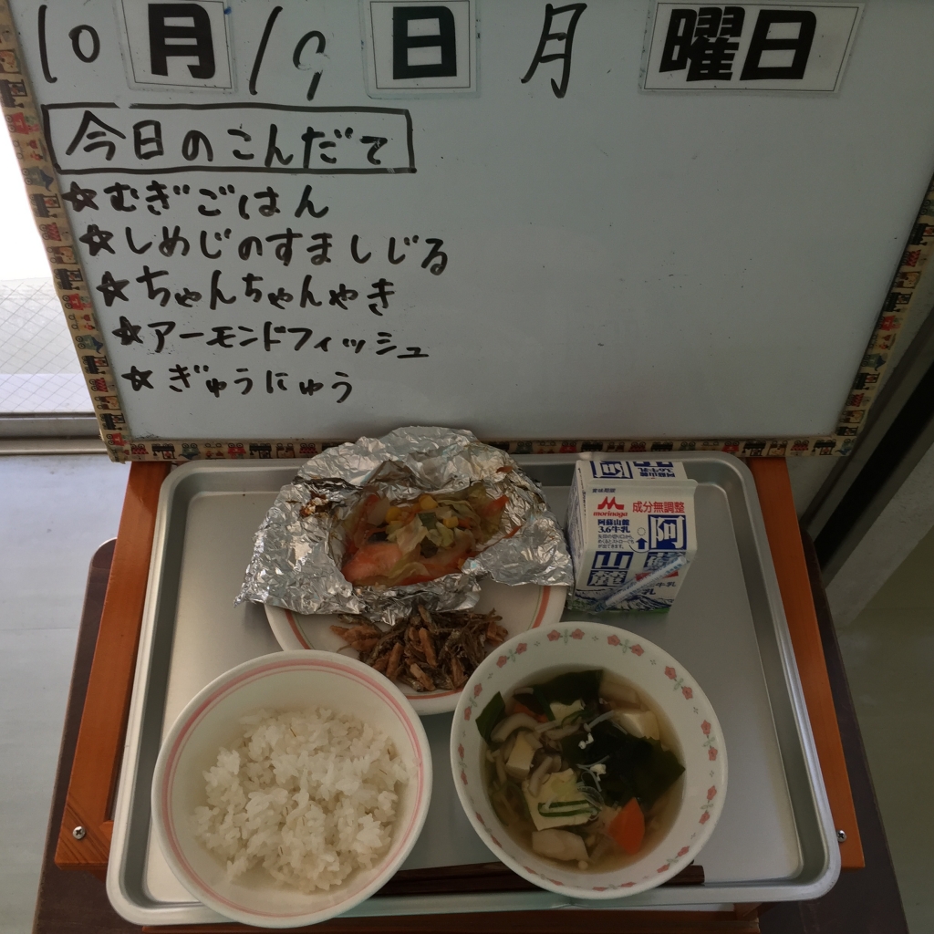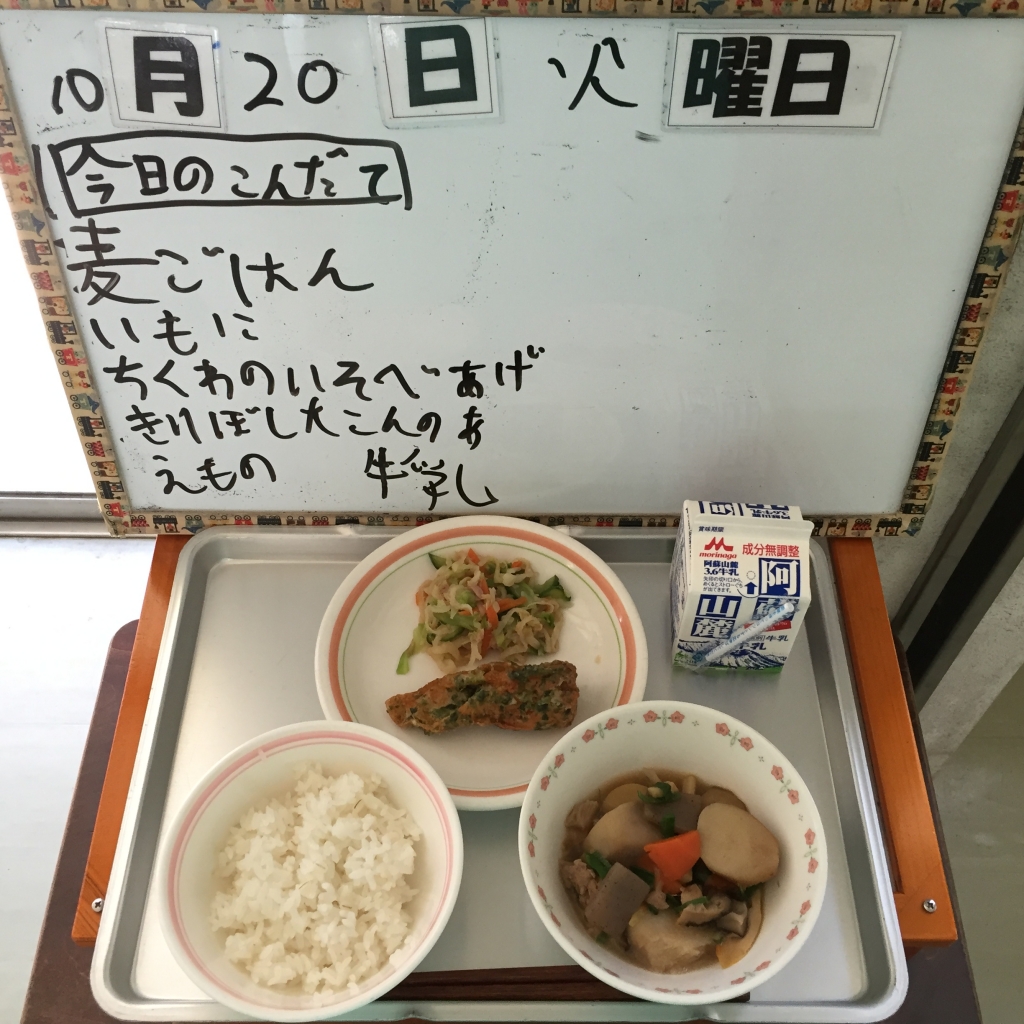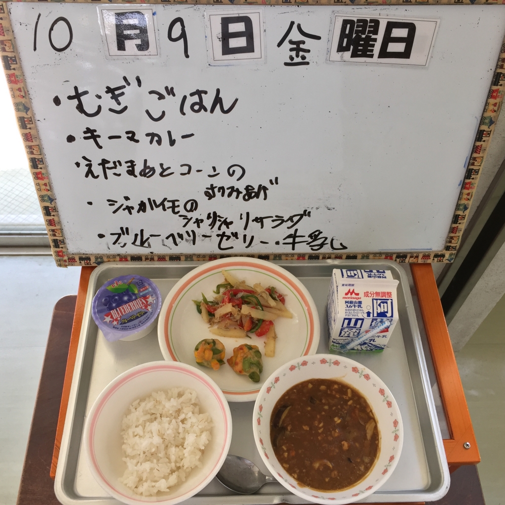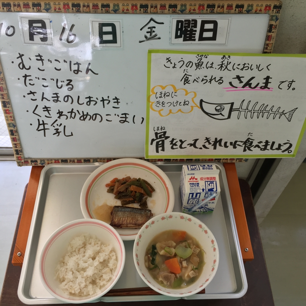 10月5日(月)横島小学校では、広いランチルームに全校児童が集まって給食を食べています。となりの給食室で、給食の先生方が一生懸命に給食を作っています。できたてのおいしい給食を毎日食べることができるこどもたちは幸せです。