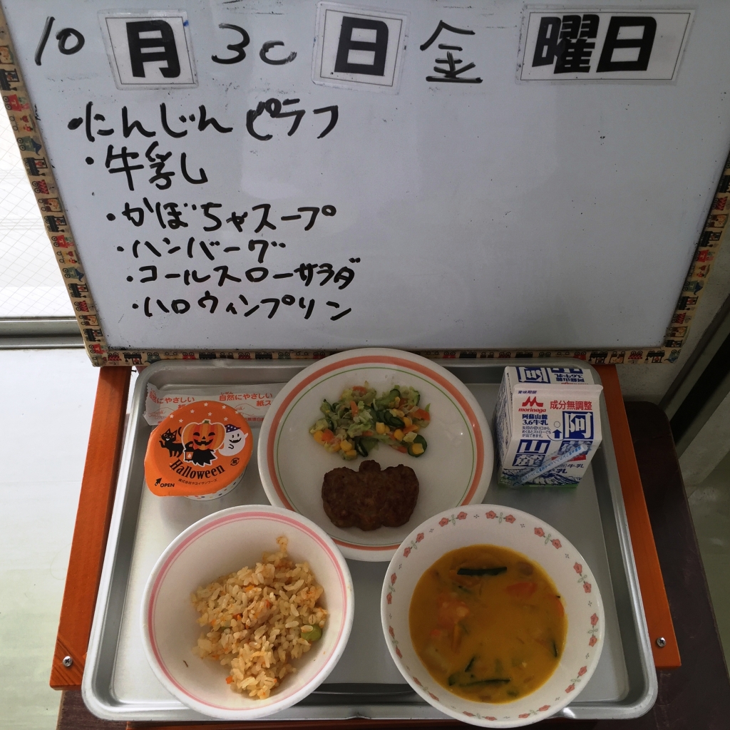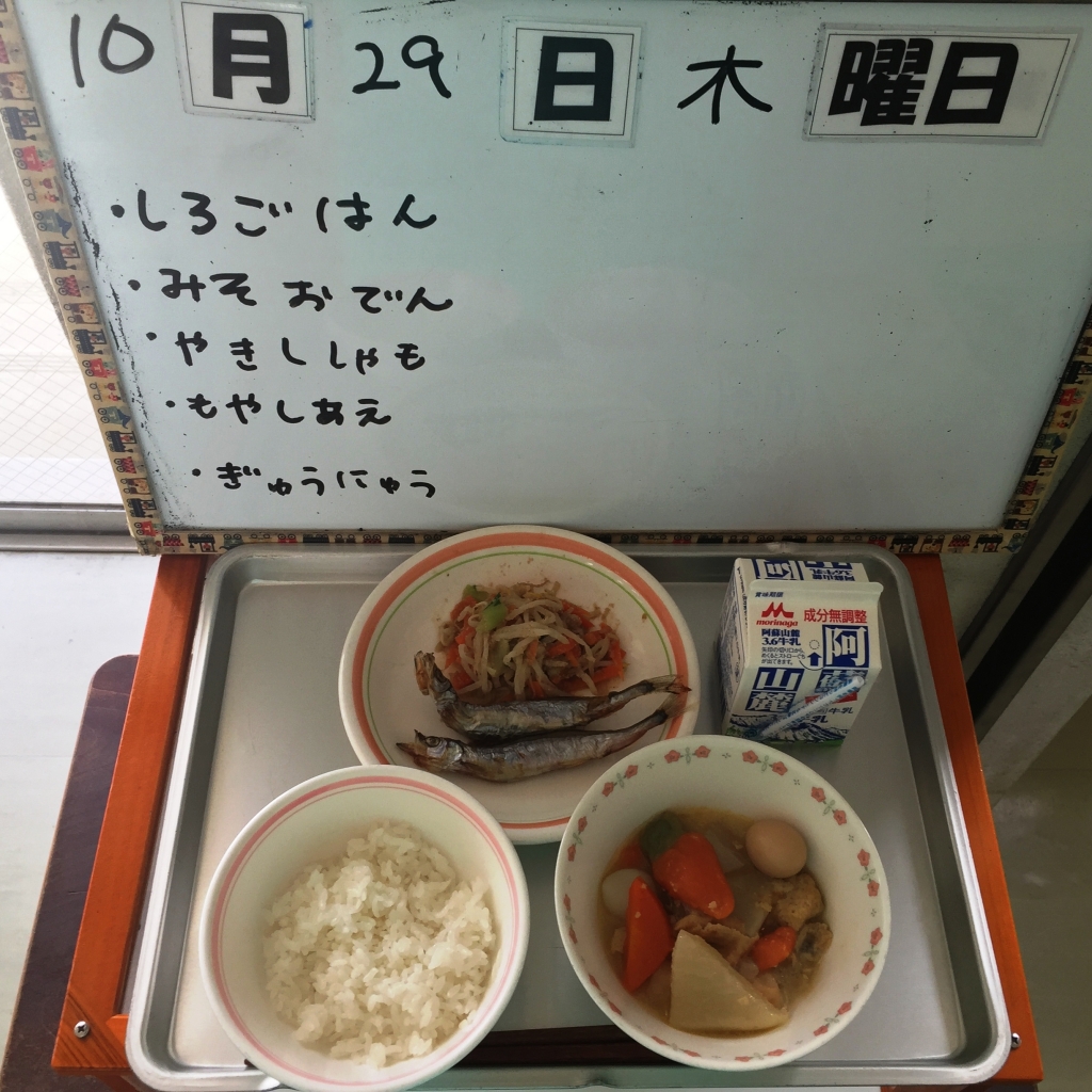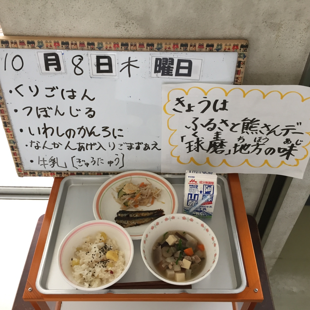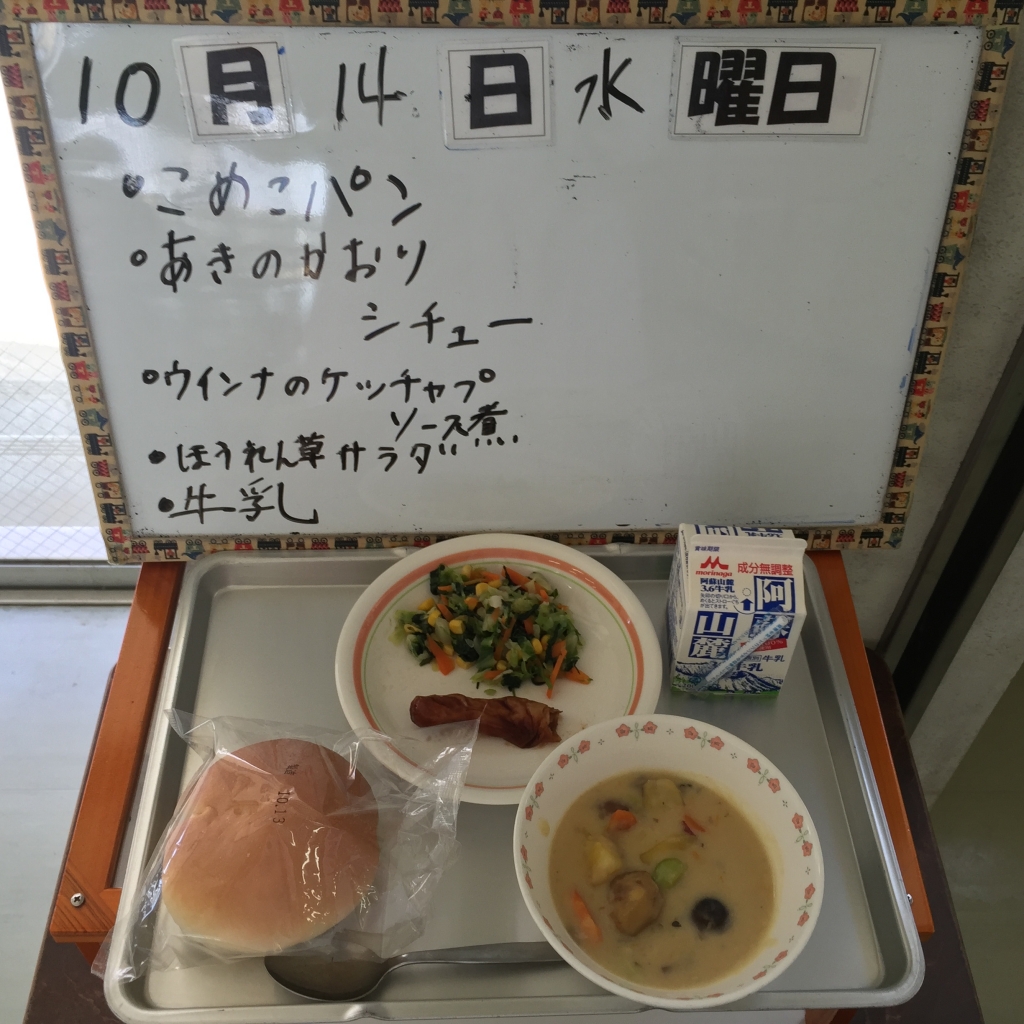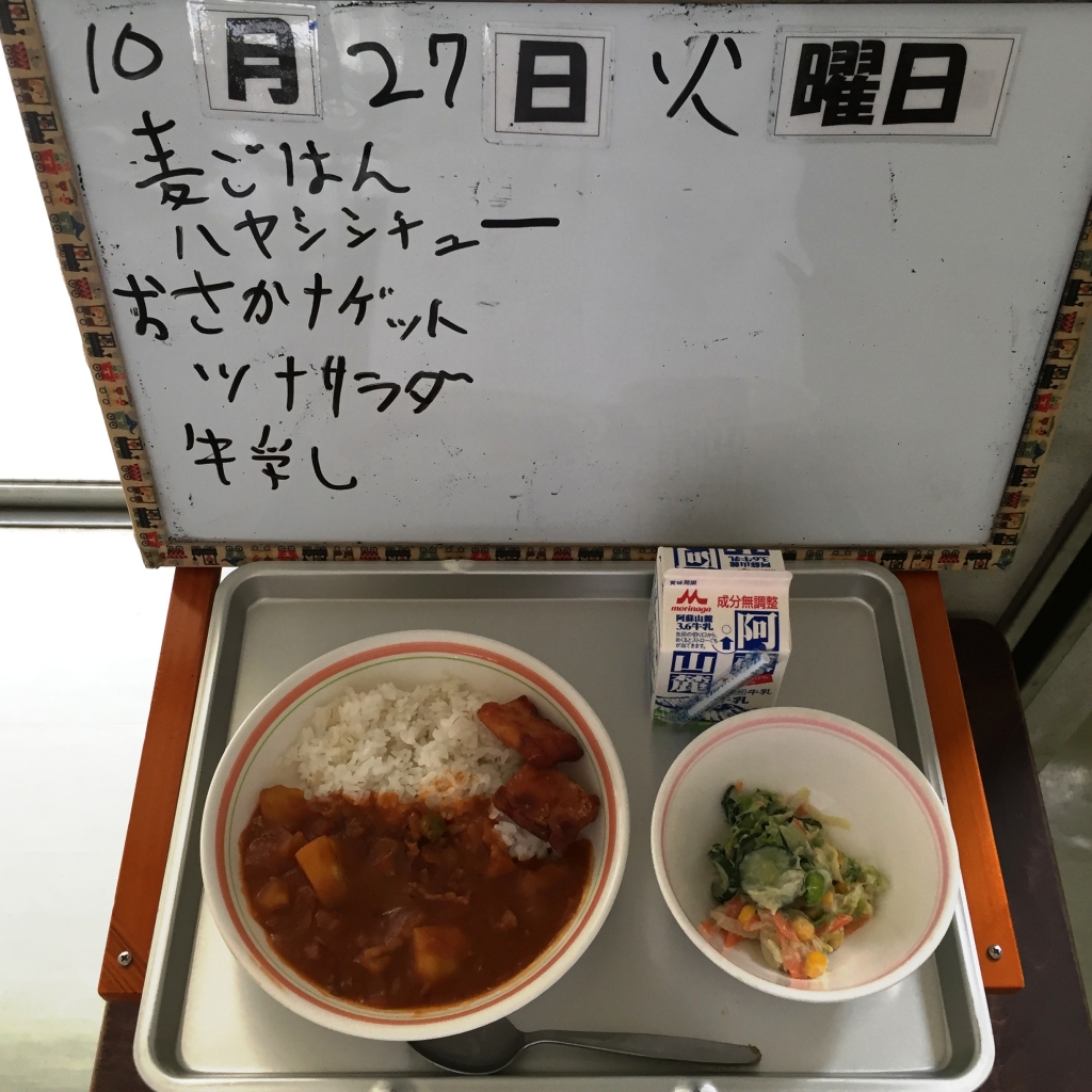 10月5日(月)横島小学校では、広いランチルームに全校児童が集まって給食を食べています。となりの給食室で、給食の先生方が一生懸命に給食を作っています。できたてのおいしい給食を毎日食べることができるこどもたちは幸せです。