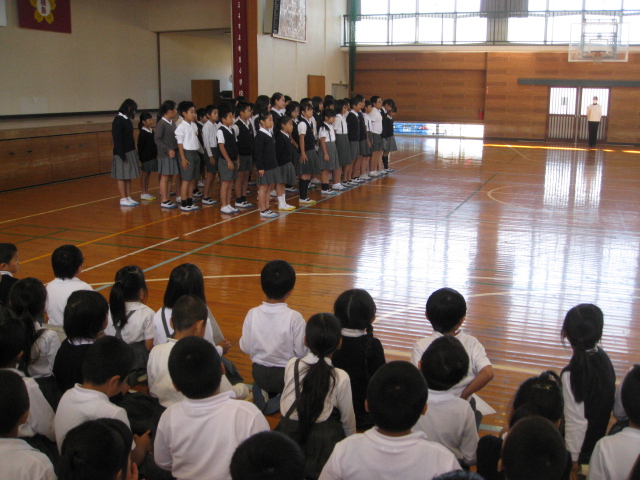 10/1(月) 月初め集会がありました。生活担当の先生から、今月のめあてと服装についてお話がありました。みんなで、今月の歌「もみじ」を合唱した後、2,4,6年生の音読発表がありました。6年生は「お経」というおもしろい詩を、本当のお経のように音読してくれました。