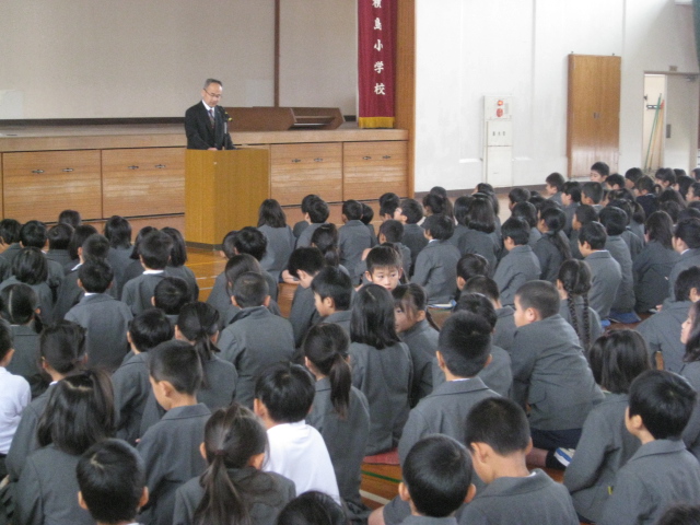 12月24日(木)冬休み前の全校集会がありました。校長先生の話、表彰、冬休みのくらし、校歌斉唱がありました。校歌斉唱はオーケストラバージョンでした。慣れるには少し時間がかかりそうです。