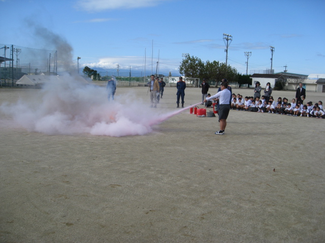 11月24日(火)火災の避難訓練がありました。有明消防署天水分署の署員の方々に指導していただきました。避難の様子は、落ち着いてできていたのでよかったけど、何人かがにやにやしていたので、もっと真剣にとりくんでほしいという話がありました。その後、消火器の使い方の実技指導もありました。これから火事が多くなる季節です。十分に気をつけていきたいと思います。