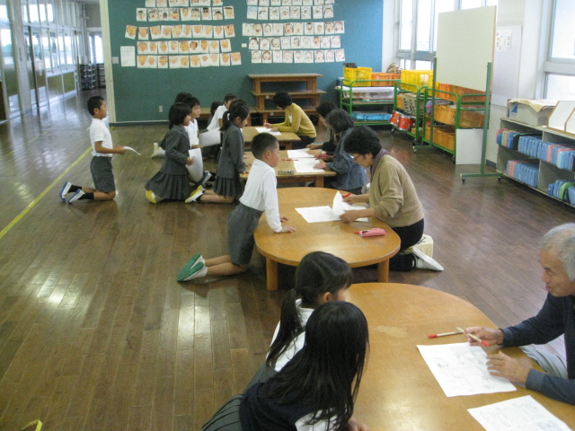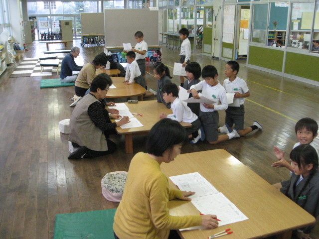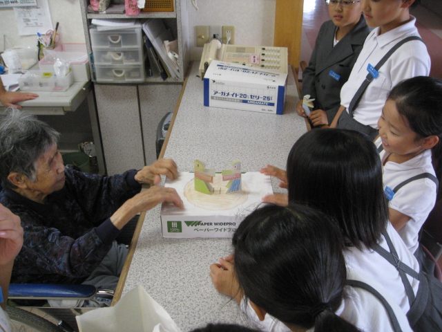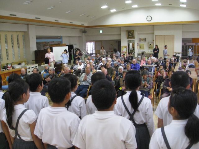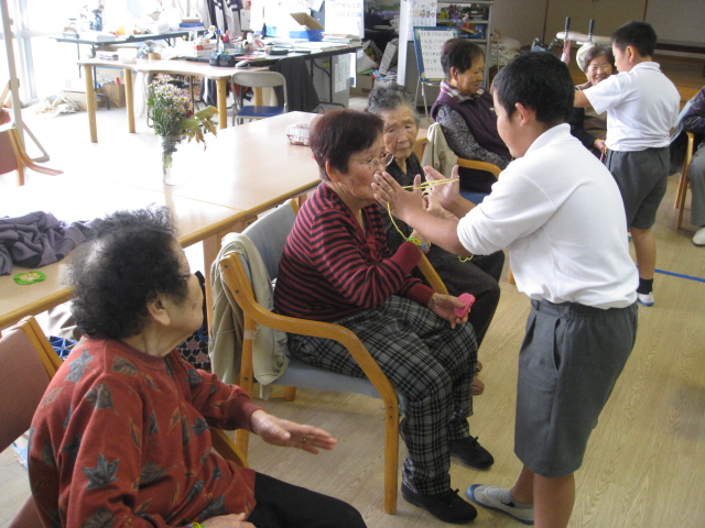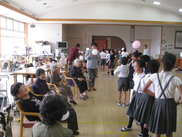 4年生が、総合的な学習の時間の学習として、慈幸苑に行って、デイサービスや入所されている方々と交流をしました。班毎に風船バレーや紙相撲、あやとり等をして一緒に遊びました。また、全体の前で、子ども達が「365歩のマーチ」「ビリーブ」を合唱し、「ドラゴンナイト」のリコーダー演奏をしました。お年寄りからアンコールがあり、「365歩のマーチ」はもう一度合唱しました。大変より交流ができました。