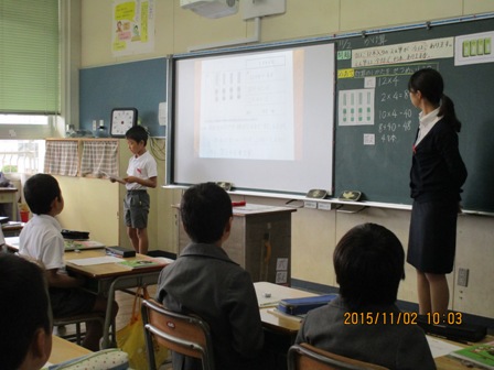 11月2日(月)2時間目に3年2組で研究授業がありました。初任の佐伯先生が授業をしましたが、とてもよい授業で授業が進むにつれて、最初の問題ではできなかった子どもが、何問かやっていくうちに、最後の練習問題ではできるようになっていました。
