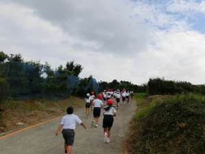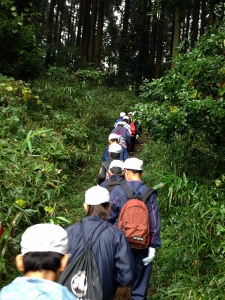 入所式のあと、ハイキングで山道を歩いています。