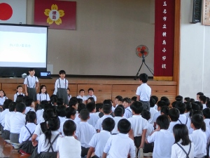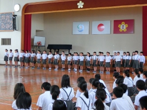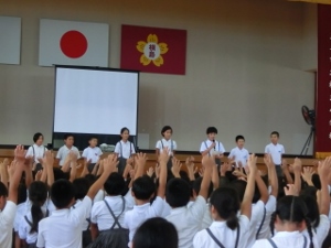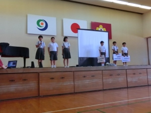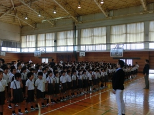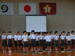 9/4(火) 9月の月初め集会がありました。まず、ALTの先生の紹介がありました。英語と日本語の両方で自己紹介をしてくださいました。生活指導の先生のお話や、放送・音楽委員会の発表があり、最後にみんなで「歌えバンバン」を歌いました。1年生が元気良く歌ってくれました。