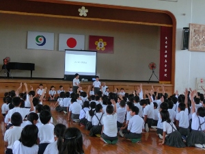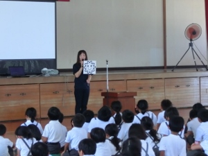 9/14(水) 音読集会は1年生の発表でした。「あひるのあくび」を上手に発表しました。