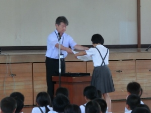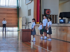 10/5(金) 前期終業式がありました。代表で4人の児童が、前期を振り返り、がんばったことを発表しました。明日から3連休です。安全に気をつけて楽しい連休を過ごしてください。