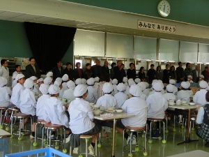 2/15(金) 先日、JAたまな女性部より手作り味噌をいただきました。今日は、そのお味噌を使って作られた給食を、教育委員会とJAたまな女性部の方と一緒にいただきました。今日のメニューは豚汁でした。おいしいお味噌をありがとうございました。