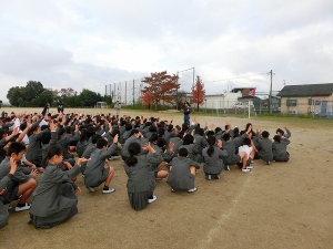 5/2(水) 月初め集会がありました。校長先生、生徒指導の先生のお話があり、運動会に向けて体育委員を中心にラジオ体操の練習をしました。また、運動会で歌う校歌と「ゴーゴーゴー」を練習しました。とても上手に歌えました。